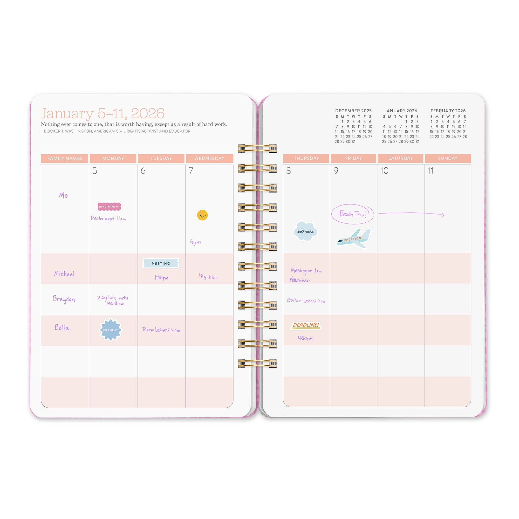 Manage even the busiest schedule with the easy-to-use Do It All Calendar from Orange Circle Studio. The large grid provides plenty of space to jot down appointments and reminders. Write up to five family members' names on the fold-out wings to keep track of everyone's important events throughout the year, and store receipts, tickets, and more in its handy pocket. Use the more than 300 stickers to mark holidays, appointments, and other important dates. With a strong magnetic hanger, you can mount this calendar on any magnetic surface or use the traditional nail hanger. Unique illustrations and designs adorn every page, with the artist benefiting directly from each calendar purchased, further supporting creative communities around the globe.